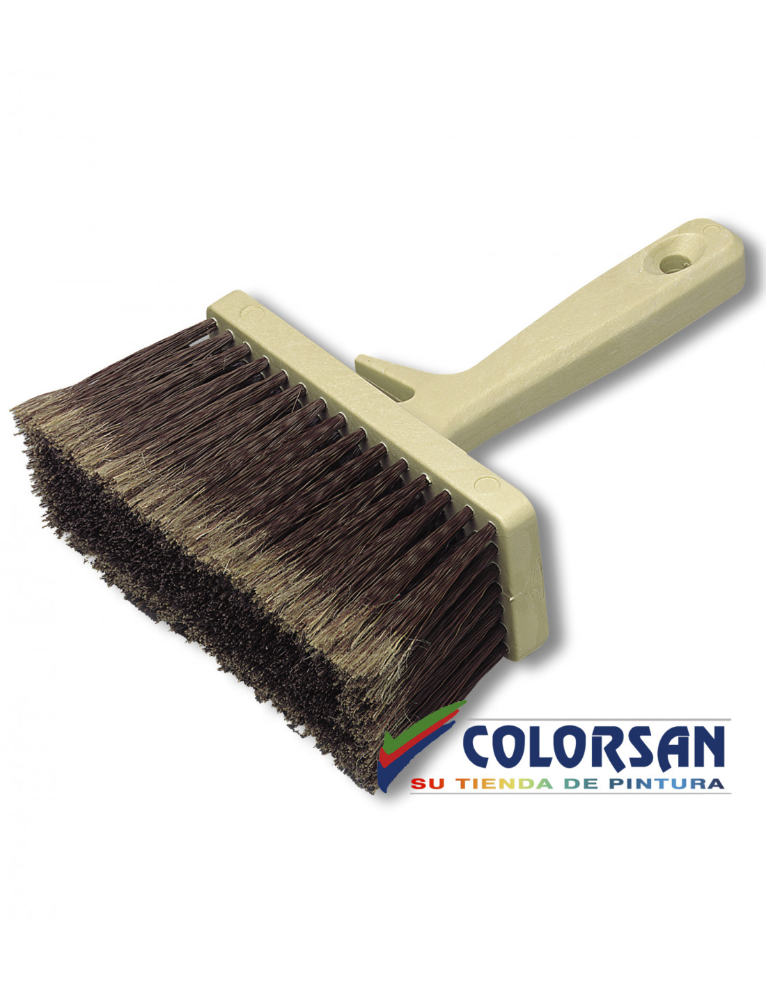 Cepillo con fibras sintéticas, PVC marrón, mango y suela monobloc de polipropileno.